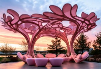 這是一件不銹鋼抽象景觀雕塑,以流動纏繞的曲線為主體,淺藍與鎏金質感相互映襯,造型如隨風舞動的靈動緞帶,線條柔美卻充滿張力。整體光潔精致,光影隨曲面流轉變化,適配戶外空間陳設,兼具現代藝術美感與視覺沖擊力,為場地注入靈動雅致的藝術氛圍。